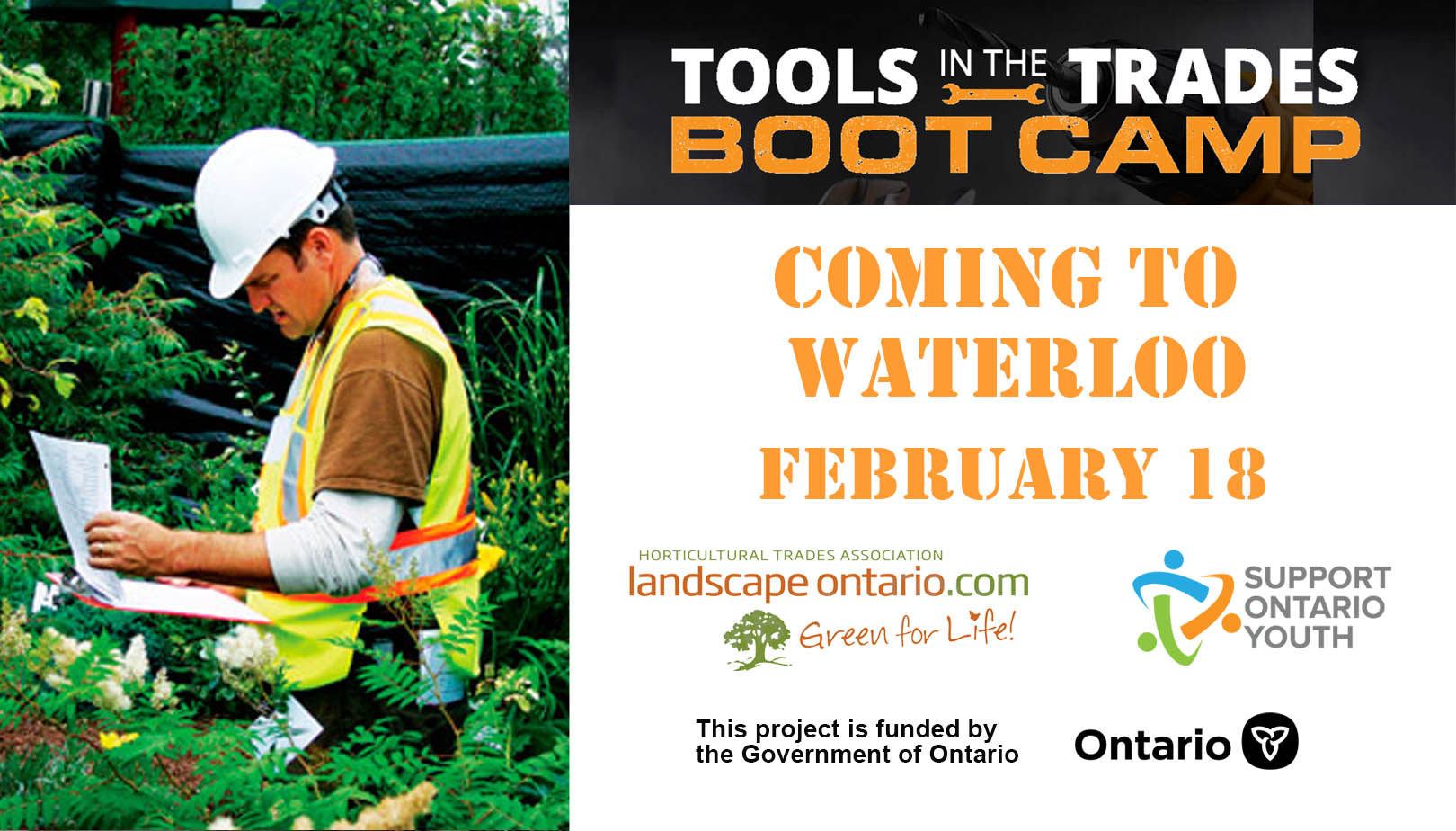 Come join us at Tools in the Trades Boot Camps, where apprentice candidates from around the province, both graduating SHSM students and adult job seekers, will be taking part in a one-day, intensive introduction to the trades hosted by Support Ontario Youth and Landscape Ontario.